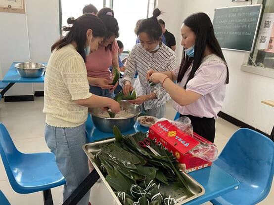 在公司食堂,各員工圍在一起,紛紛露出看家本領(lǐng),將早已準(zhǔn)備好的粽葉、糯米、板栗、腌肉、繩子等必備食材擺放在桌上,圍著餐桌包起粽子,互相交流著包粽子的技巧,折粽葉、填糯米、壓緊實、封口、扎捆,整個活動現(xiàn)場一片歡聲笑語。很快,糯米經(jīng)過大家的巧手,瞬間變成了有棱有角的粽子呈現(xiàn)在眼前,大家一起聊端午習(xí)俗,共同感悟中華民族博大精深的文化。