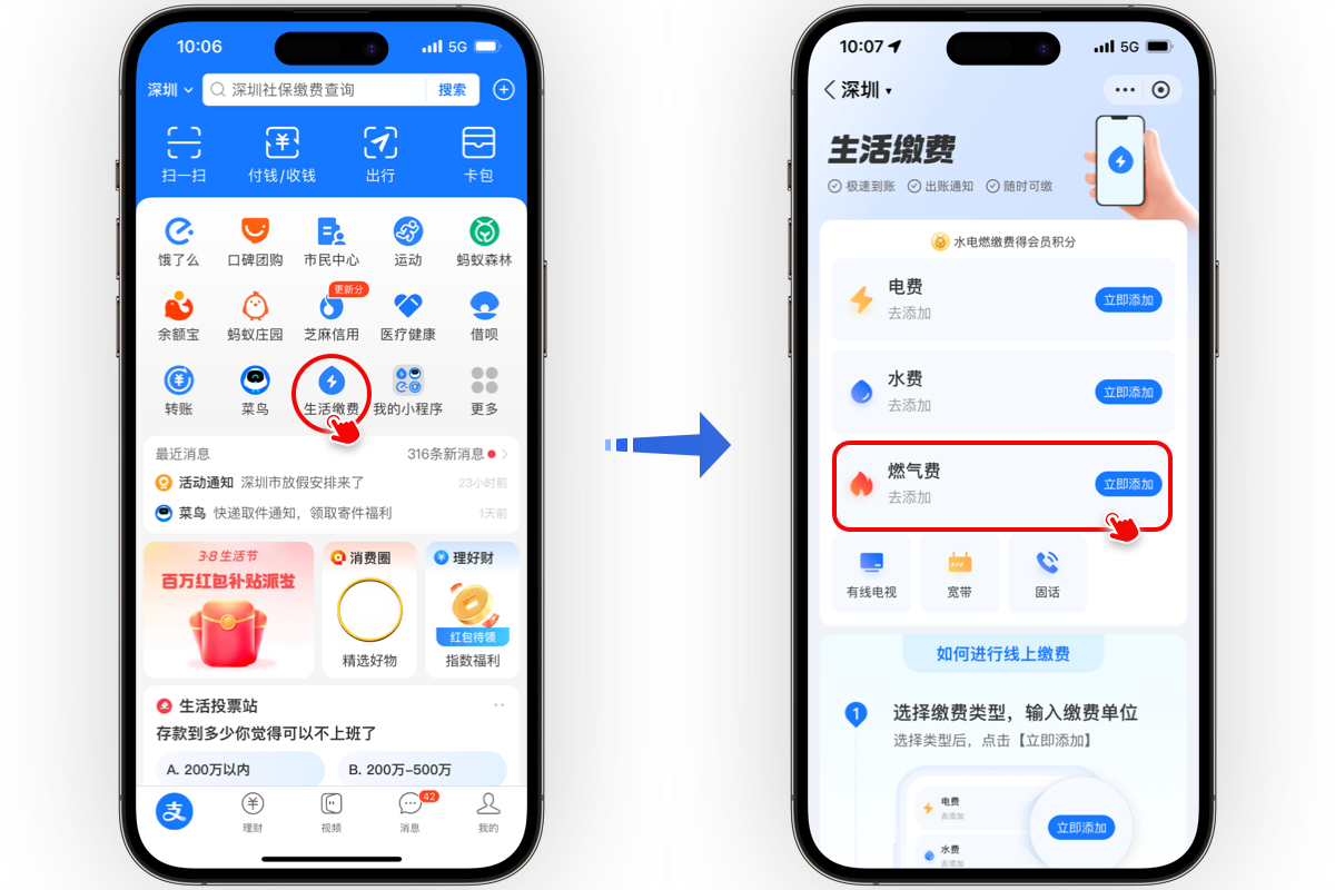 登錄支付寶,選擇[生活繳費」一「燃氣費」,輸入戶號進行燃氣繳費及預(yù)存。