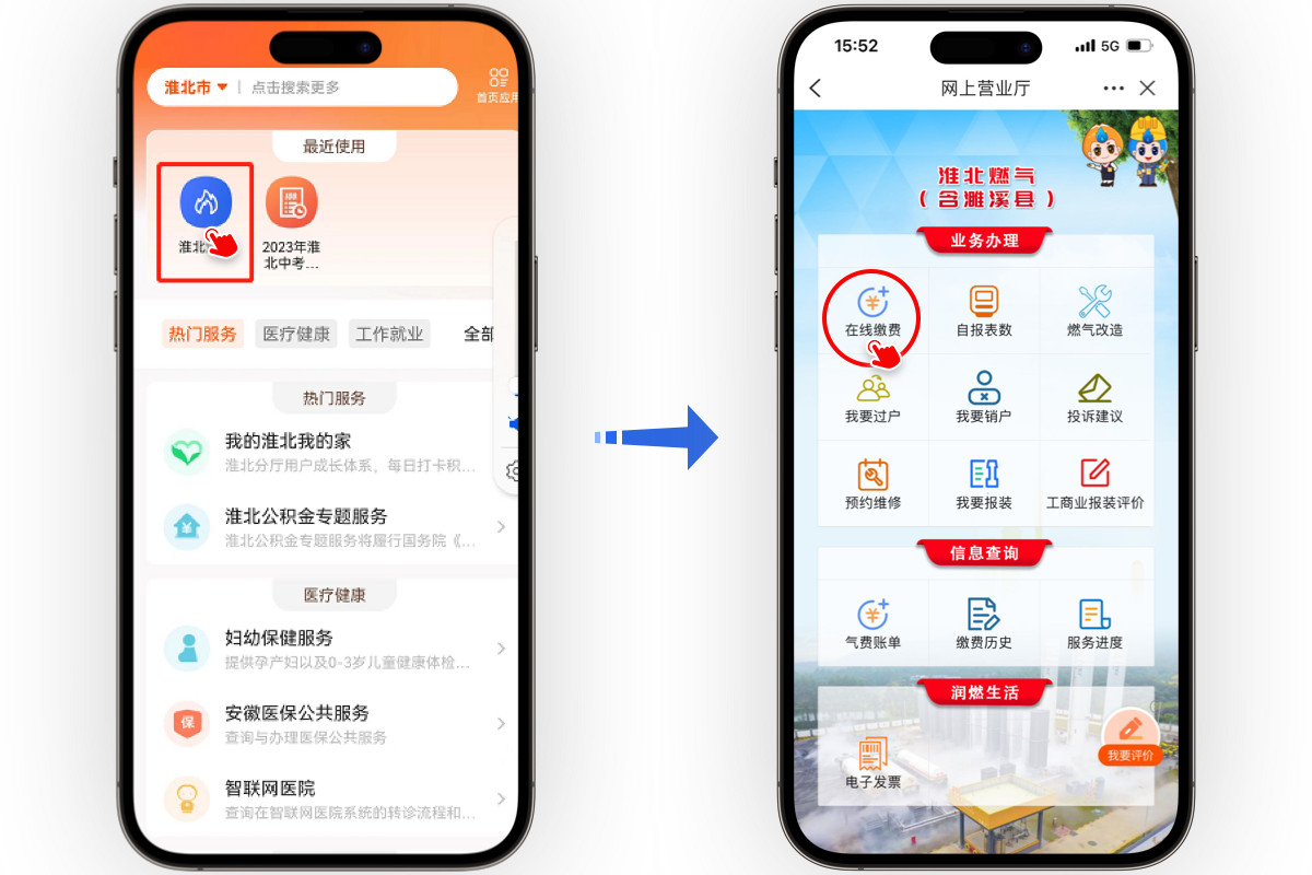 登錄皖事通,搜索[淮北燃氣]-[網(wǎng)上營業(yè)廳]-[在線繳費],進行燃氣繳費及預(yù)存。