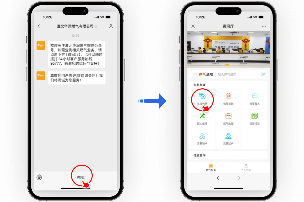 微網(wǎng)廳繳費:打開微信公眾號,關(guān)注“淮北華潤燃氣有限公司”,點擊[微網(wǎng)廳]-[充值繳費],輸入用戶號進行燃氣繳費及預(yù)存。 |