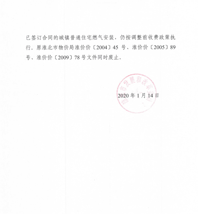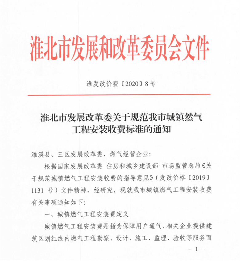 淮北市發(fā)展改革委關(guān)于規(guī)范我市城鎮(zhèn)燃?xì)夤こ贪惭b收費(fèi)標(biāo)準(zhǔn)的通知(2020年8號(hào))