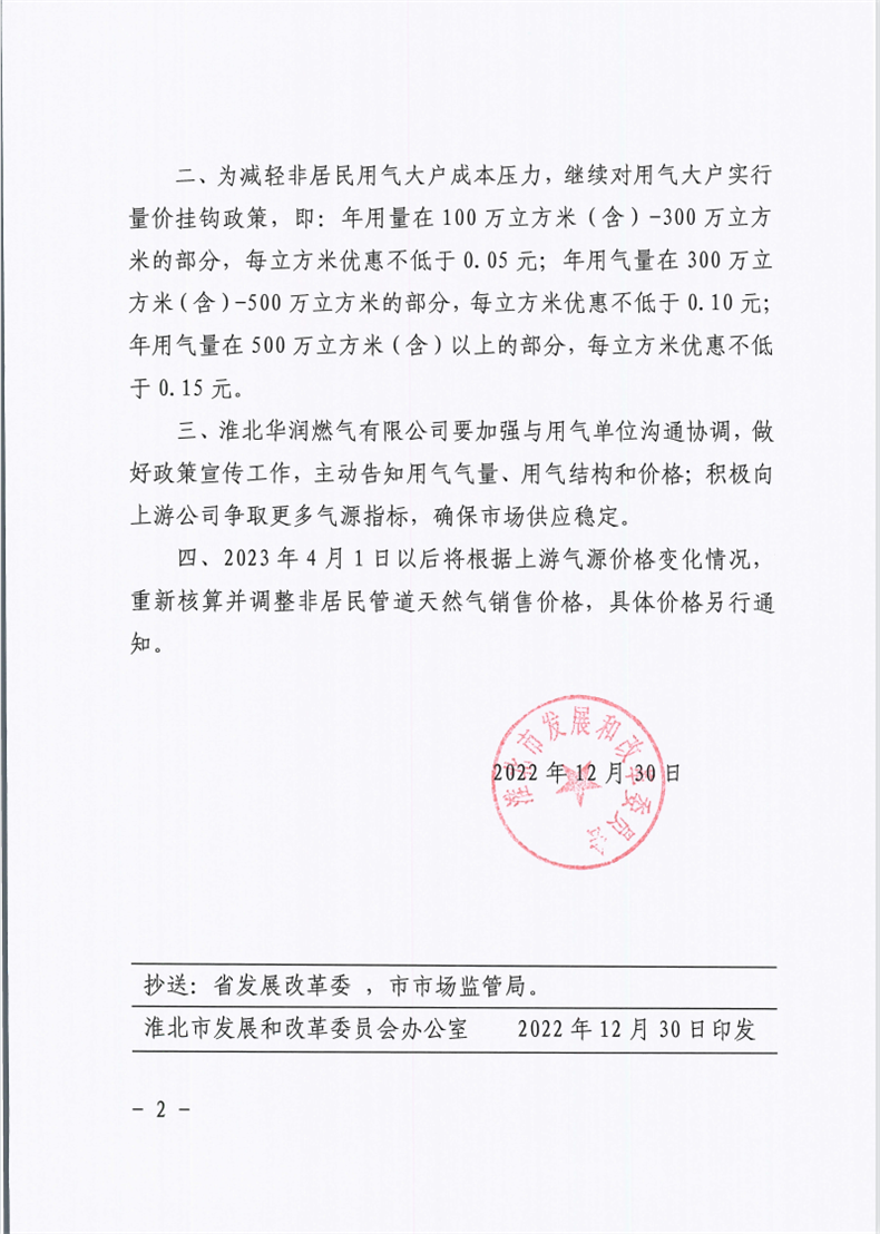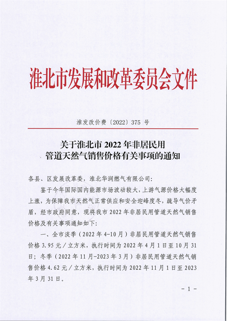 關(guān)于淮北市2022年非居民用管道天然氣銷售價(jià)格有關(guān)事項(xiàng)的通知