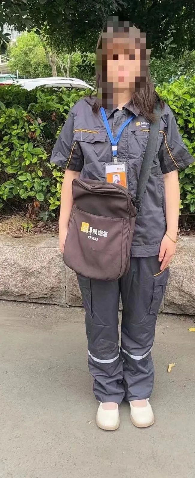 華潤(rùn)燃?xì)獍矙z人員上班期間,身著全套藍(lán)色工作服。佩戴工牌,背著黑色工具包,且服飾、工作牌和背包上均印制華潤(rùn)燃?xì)鈒ogo。